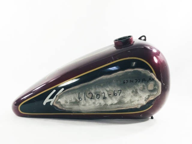 No broken parts, tank does not appear to leak. Tank is 5 gallons and the inside is nice. Harley P/N: 61202-67 Applications: 1967-1977 FLH Location: Farm