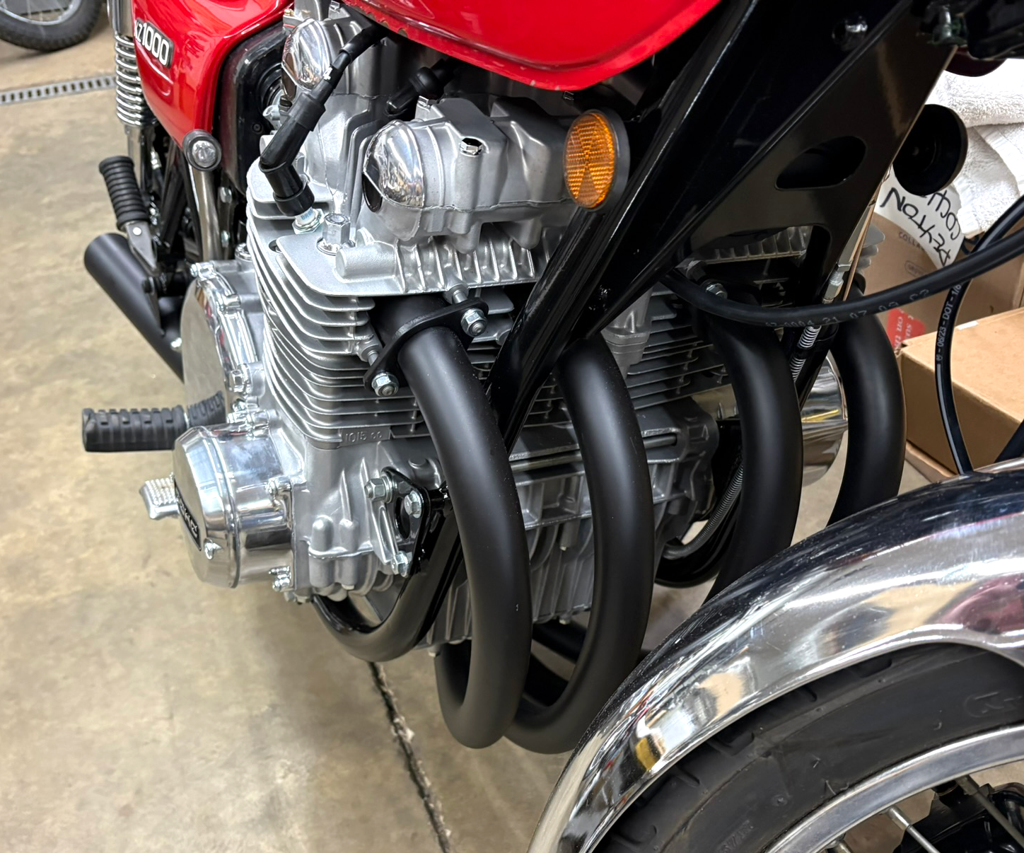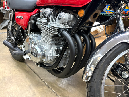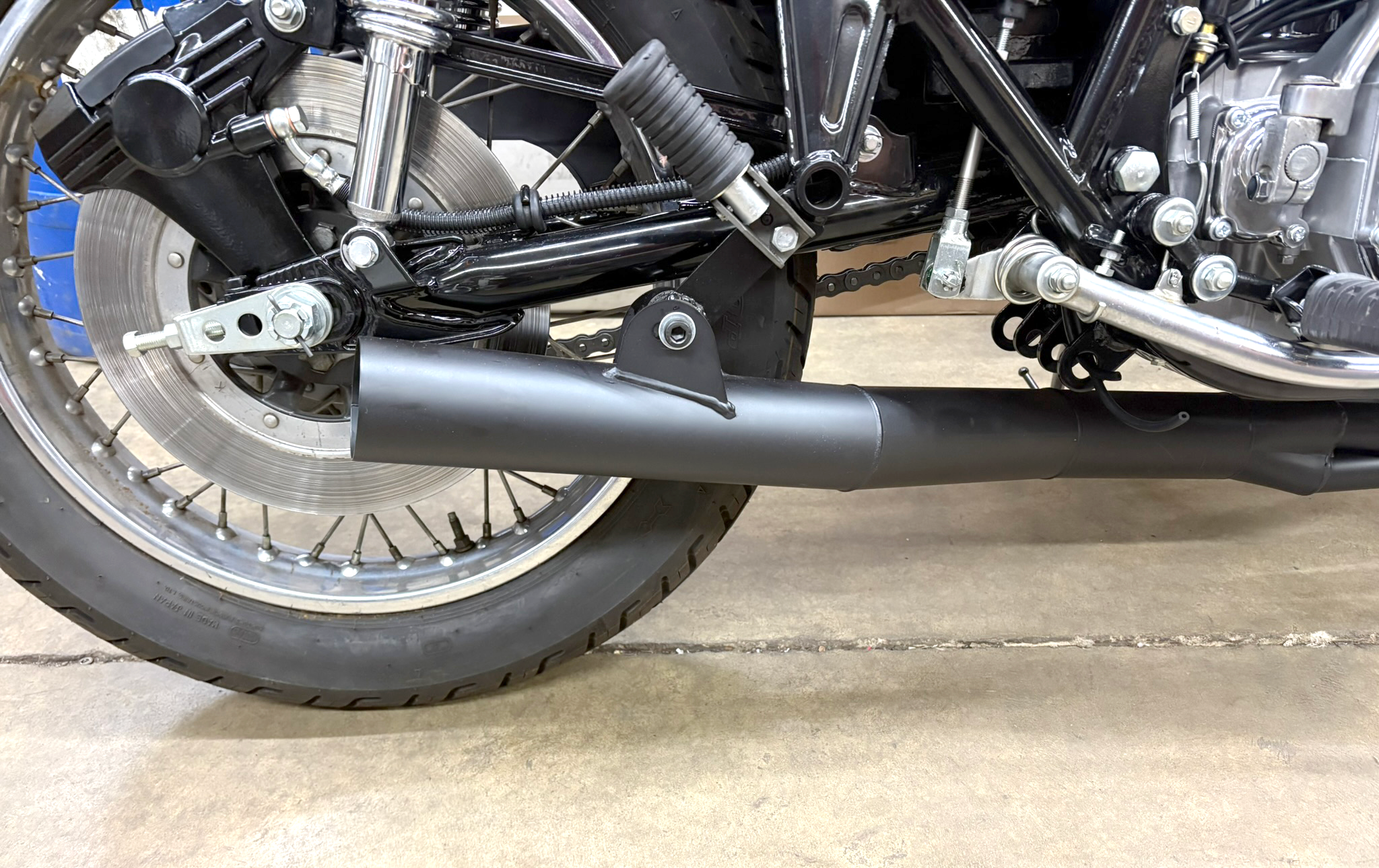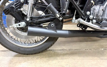 This retro-style exhaust muffler continues to be a firm favorite among Z1 riders. The pipes are carefully shaped and painted, meticulously crafted by skilled artisans. The matte black finish enhances the look. Steel flanges are included, as well as mounting hardware. The oil drain bolt cannot be removed, and oil filter changes and center stand installation are not possible with this muffler installed. The front pipe is 38mm, and the tail pipe is 70mm. The factory-installed inner silencer is 70mm. *The inner silencer is removable.